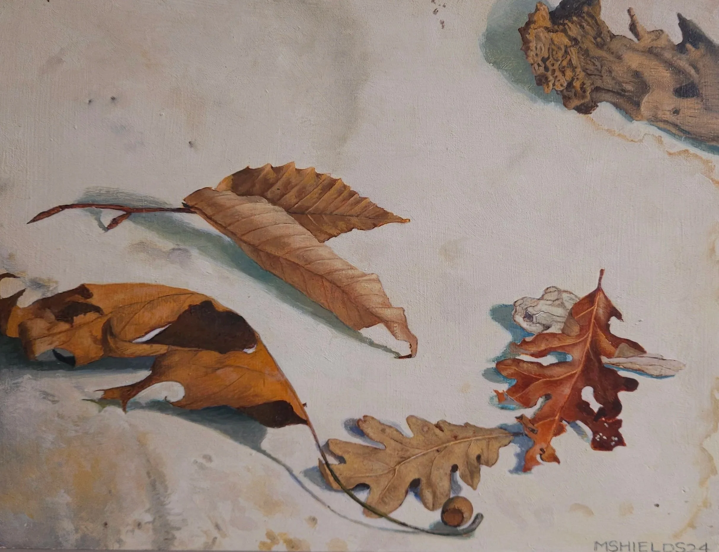 Scattered leaves, rotted branch,,oil on panel, 9x12, 2024